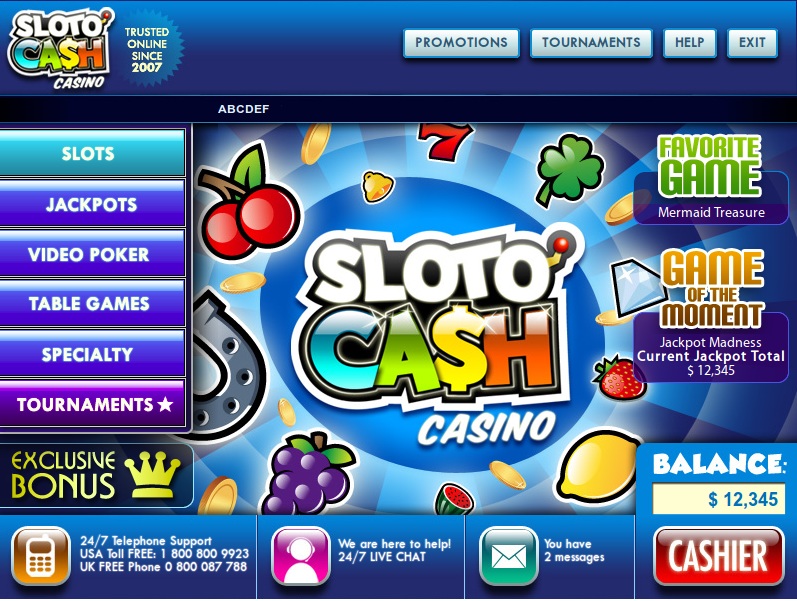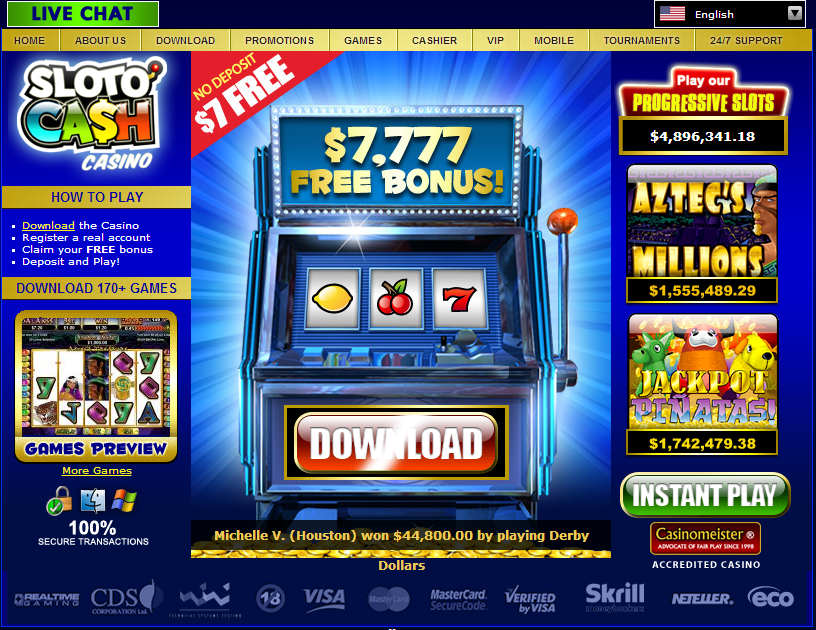 SlotoCash is an online casino that was launched in 2007. It is operated by Deck Media, one of the most reputable online casino groups in the world. The casino is licensed by the government of Curacao in the Netherlands Antilles. SlotoCash uses the world-famous RTG software brand for its games. To give online gamblers a secure playing experience, the casino uses 128-bit SSL encryption. As part of its commitment to fair gaming, the casino has had its games certified for randomness by TST, an external firm which conducts audits of various online casinos using RTG software.